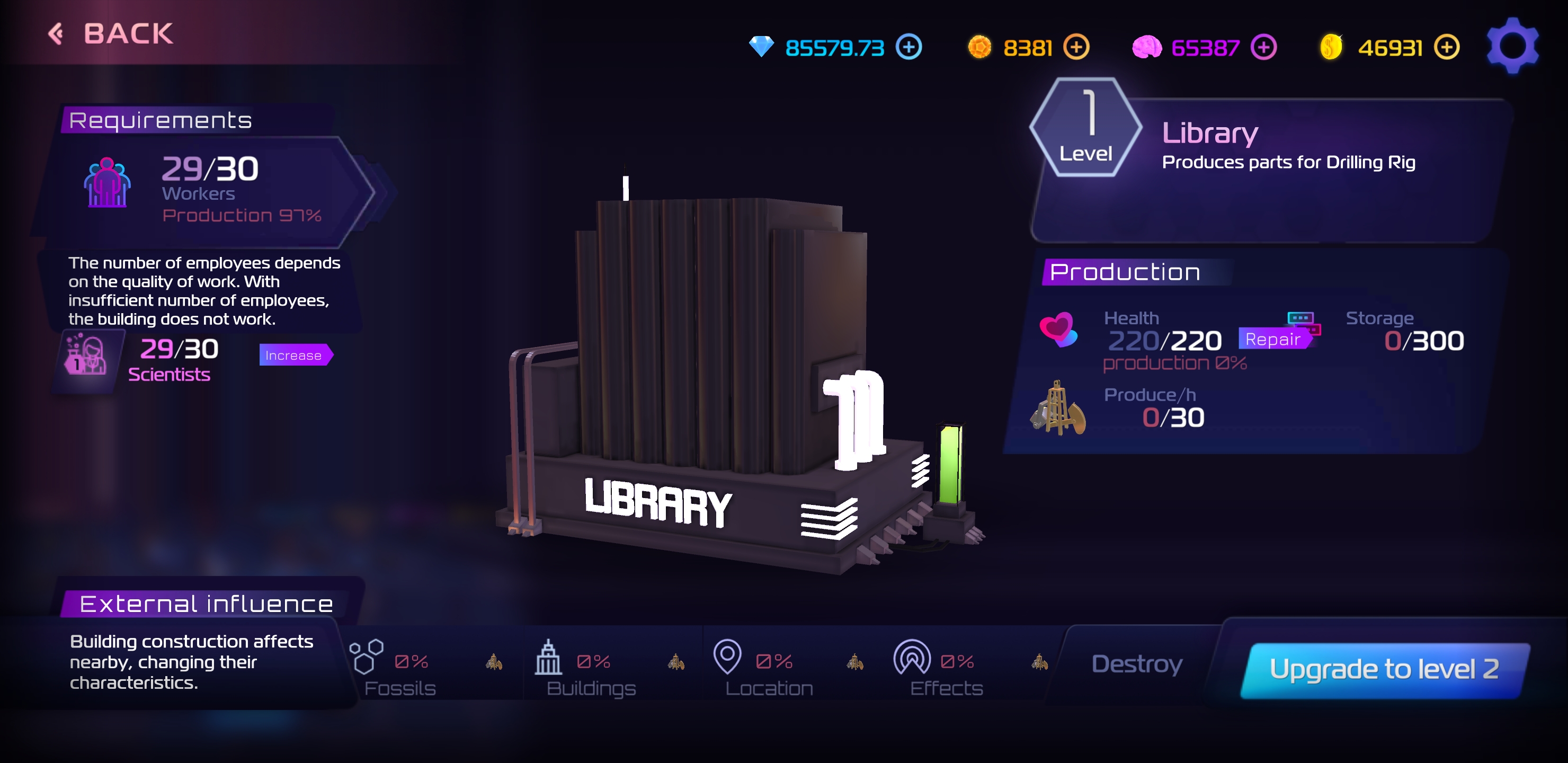 The Library building belongs to the Science branch and is used for the production of Parts for Drilling Rig. The building consumes scientists from the DNA Tower.